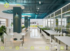 Không gian canteen được thiết kế với phong cách hiện đại, tận dụng ánh sáng tự nhiên và sử dụng nội thất tối giản nhưng tiện nghi. Sự kết hợp hài hòa giữa màu sắc và trang trí giúp tạo ra cảm giác thư giãn, thoải mái và tràn đầy năng lượng. Các khu vực được sắp xếp khoa học, rộng rãi, và luôn đảm bảo vệ sinh, mang đến cho nhân viên cảm giác yên tâm và dễ chịu trong suốt bữa ăn.